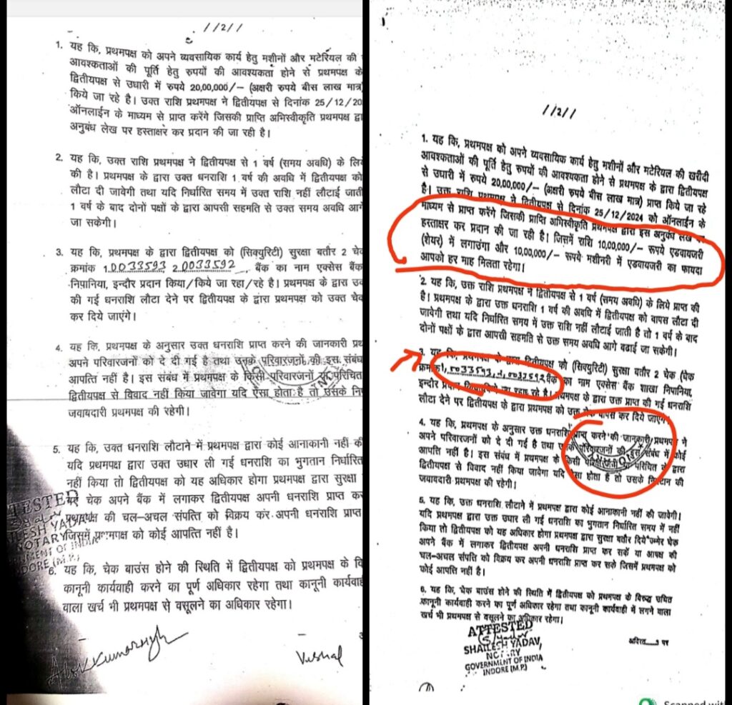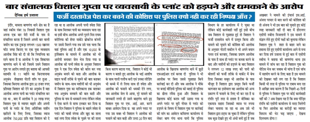 इंदौर, मामला बाणगंगा थाने क्षेत्र का है जहां स्कीम नंबर 78 निवासी विशाल गुप्ता अपना एक बार मेरी मर्जी के नाम से संचालित करता है जिसने अपनी बार वाली जमीन का एक टुकड़ा लगभग 1500 स्क्वायर फीट जगह किराए पर एक युवा व्यवसाय आलोक सिंह को दी जो कि निपानिया का रहने वाला है l आलोक ने एक शिकायत बाणगंगा थाने मे की जिसमे उसने विशाल गुप्ता पर आरोप लगाते हुए बताया की आपसी सहमति से 11 महीने का किरायानामा अनुबंध शेखावत नोटरी शॉप पर हुआ , जिसका किराया आलोक द्वारा 50 हजार रुपए प्रतिमाह विशाल को देने का अनुबंध है वहा आलोक अपना पानी का प्लांट संचालित कर रहा था , बाद में आलोक ने 20 लाख रुपए विशाल गुप्ता से व्यापार बढ़ाने और अपनी पानी के प्लांट के लिए अतिरिक्त मशीन खरीदने के लिए लिया, जिसका ब्याज आलोक ₹50,000 प्रति माह विशाल को दे रहा था l
